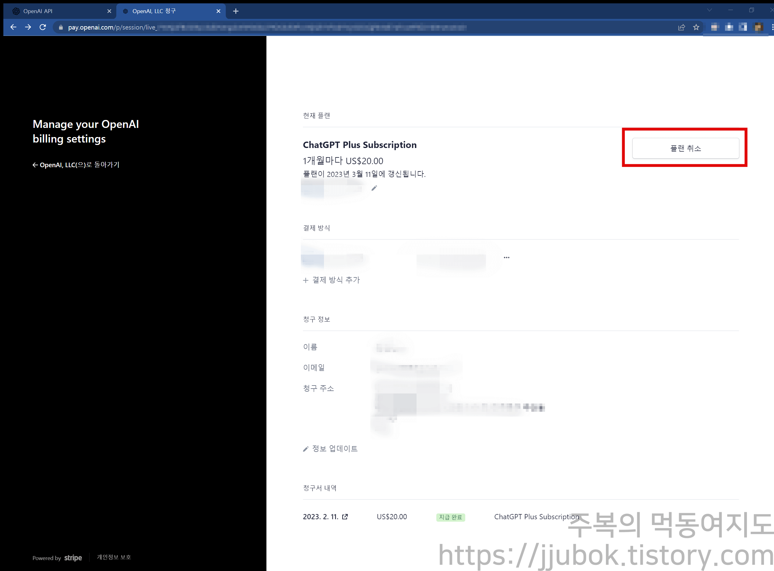 맨 밑에 Manage my subscription 등을 누르면 Manage Your OpenAI billing settings라는 창이 뜨면서 OpenAI에 입력했던 결제 정보, 주소 정보를 확인하실 수 있습니다.