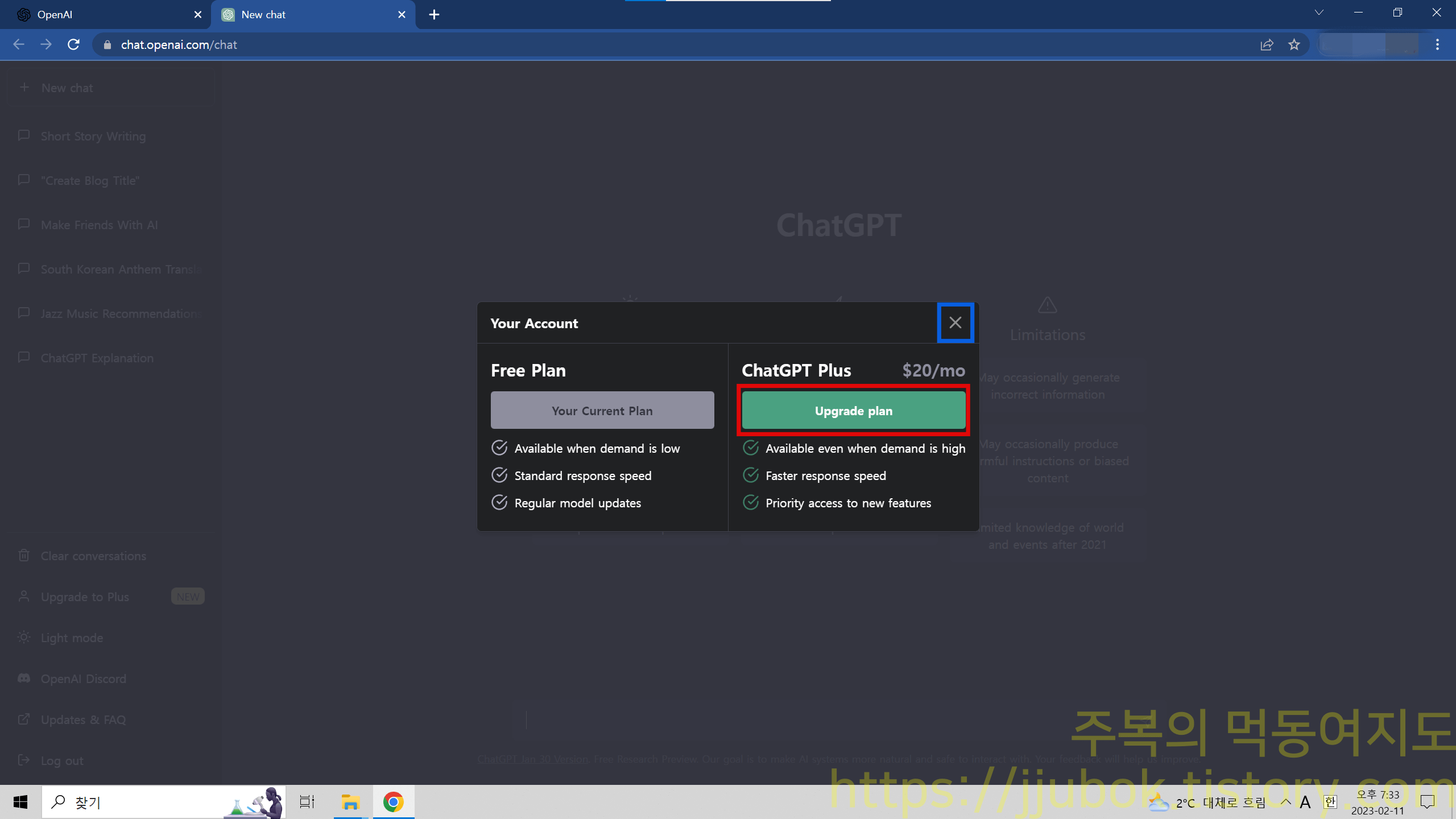 만약 여기서 결제하기 싫으신 분은 X 버튼을 누르면 되고 ChatGPT Plus 버전을 이용하시려면 Upgrade plan 버튼을 눌러주시면 되겠습니다.