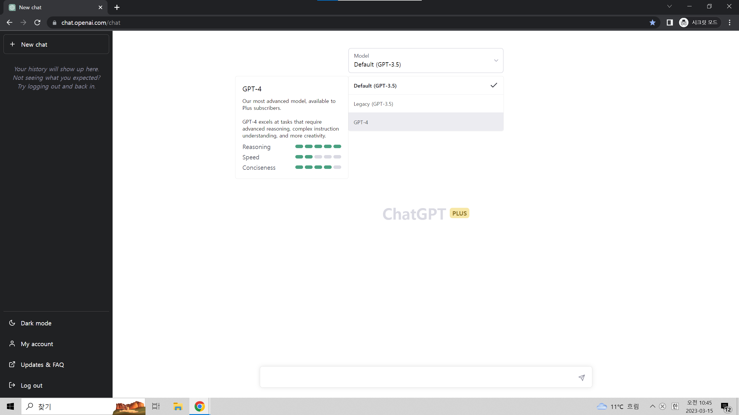 기존에 ChatGPT Plus에는 Default와 turbo가 있었는데 23. 3. 15.에 접속해보니 default(GPT-3.5), legacy(GPT-3.5), GPT-4로 모델이 분류가 되어있는 것을 볼수 있었습니다. (ChatGPT에게 물어보니 turbo는 더이상 사용하지 않는 모델이라고 함.)