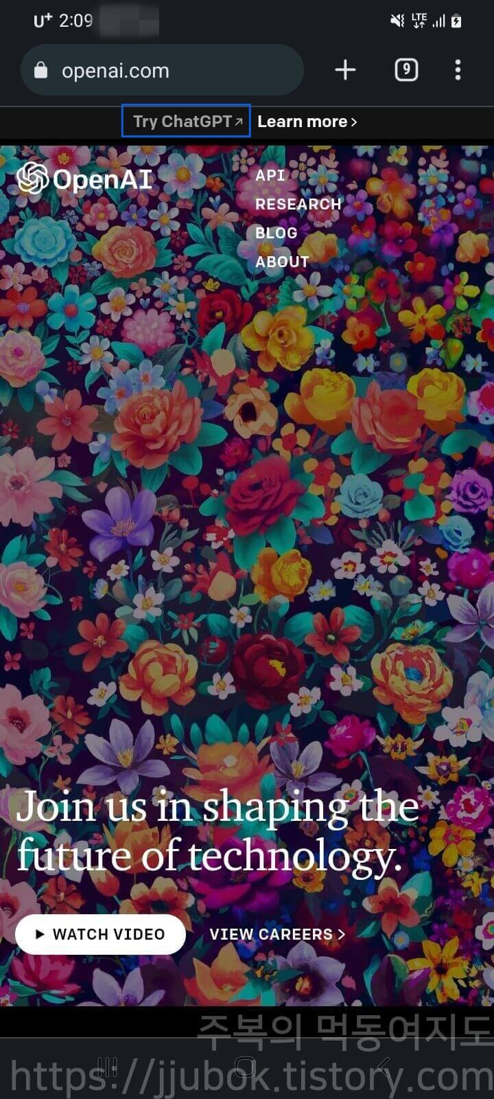 사용법은 PC와 동일합니다. Try ChatGPT > 버튼을 누르면 되겠으며 계정 로그인 이력이 없으면 로그인 화면으로 들어가게 됩니다.