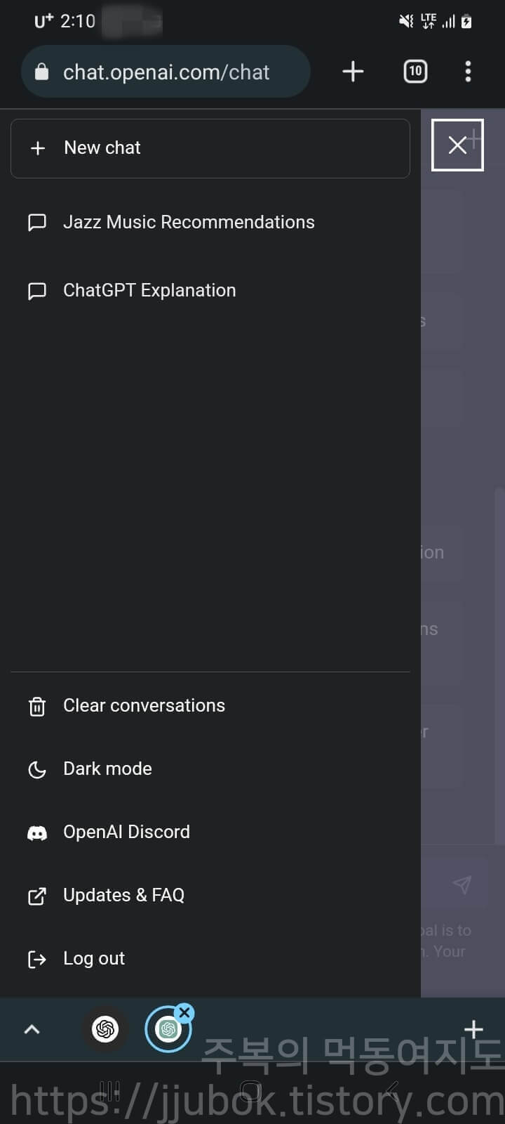 대화창에 ChatGPT에 대화를 입력하는 것과 3줄짜리 버튼을 누르면 ChatGPT의 탭과 기능을 확인할 수 있습니다.