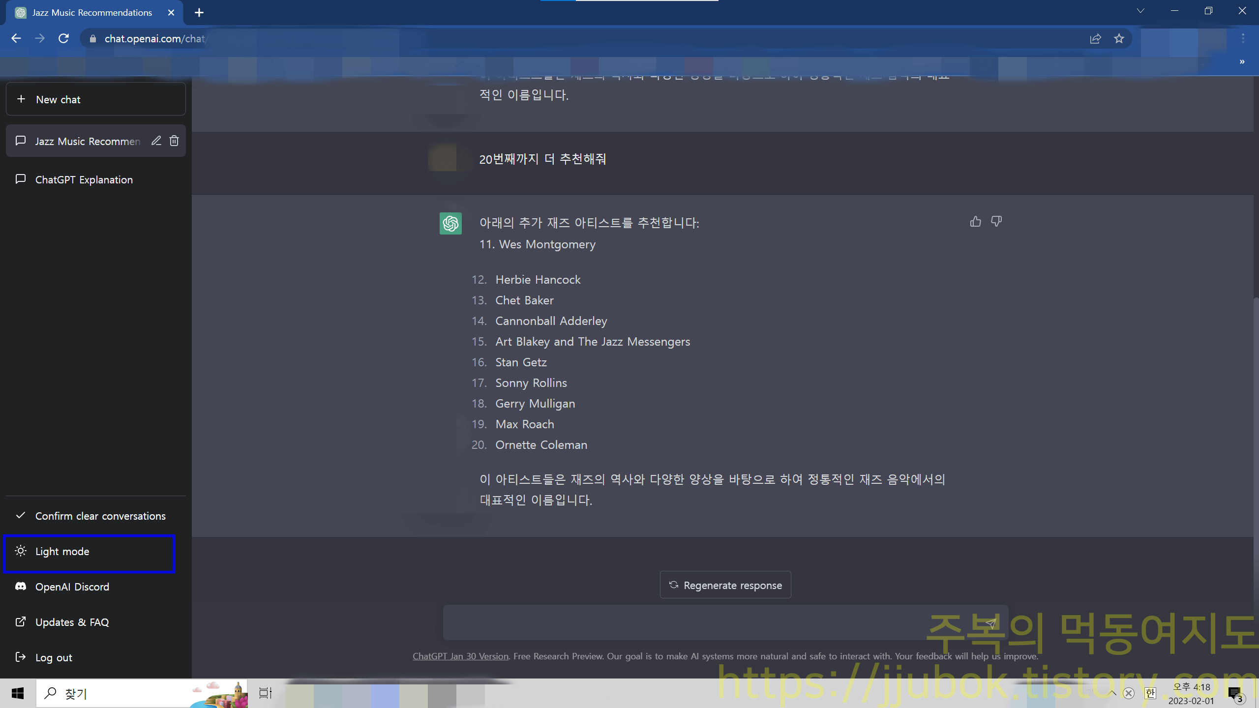 이렇게 저와 ChatGPT가 함께 나눈 재즈에 대한 이야기는 왼쪽에 자동으로 Jazz Music Recommend (재즈 음악 추천) 대화탭이 자동 생성 된 것을 볼 수 있으며 아까 전에 이야기했던 ChatGPT Explanation 탭을 클릭하면 아까 전에 나눴던 ChatGPT에 대한 대화를 다시 볼 수 있습니다.